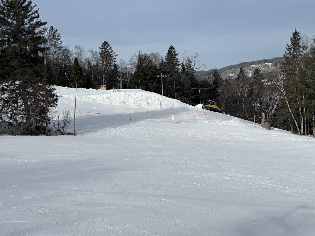 Dans la Devaleuse la glisse est rapide et le carving est tellement agréable. Je refais les pistes de ce secteur à quelques reprises. De retour dans le secteur de la côte 70 les travaux sont en cours pour remettre la piste en fonction suite à là compétition ou notre king des bosses a fait sa dernière descente.