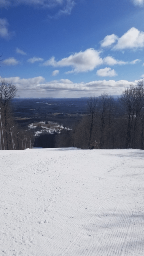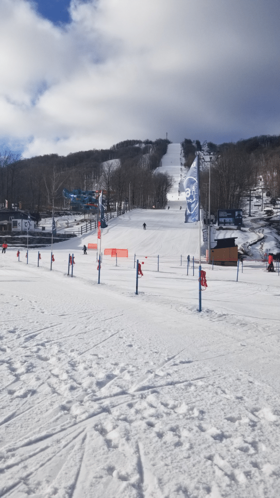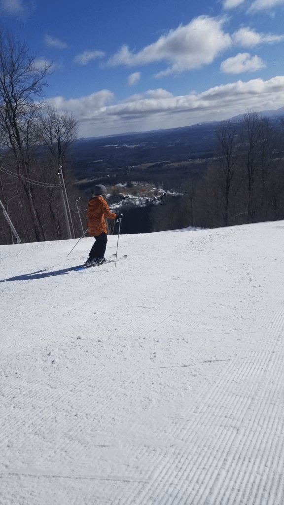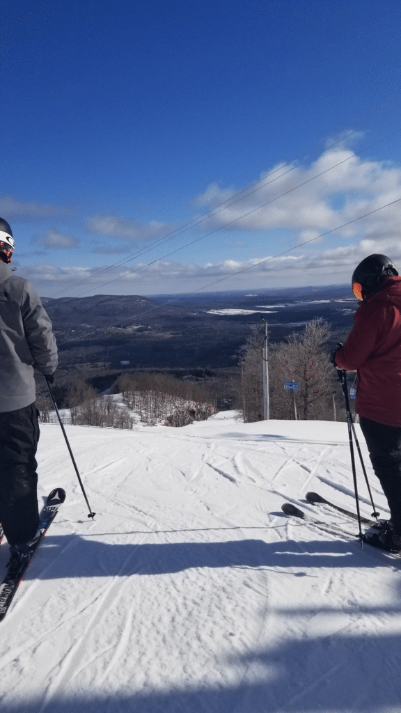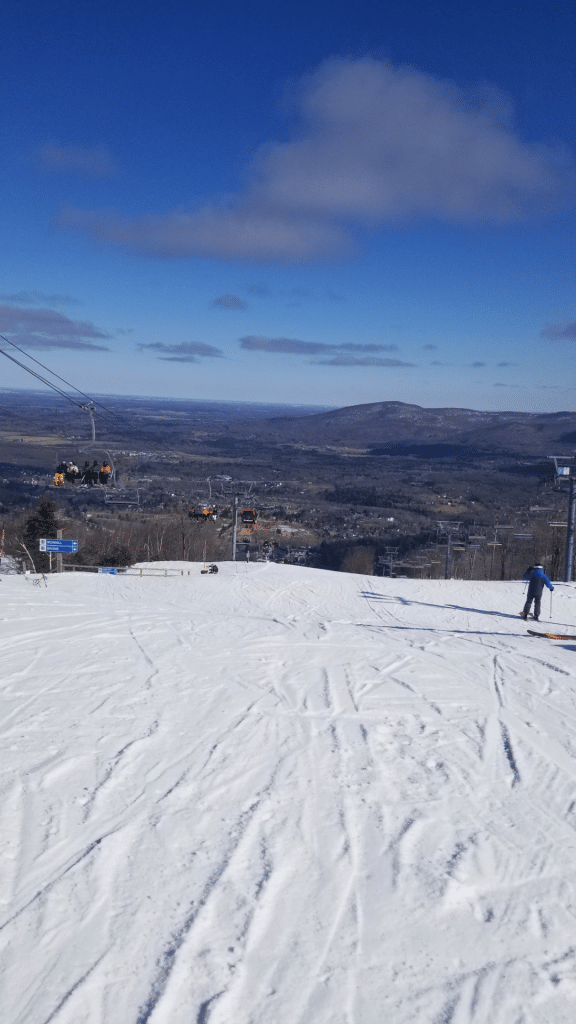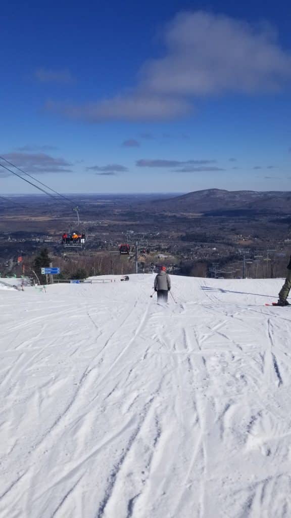Il fait -7 degrés accompagné d’un bon vent qui donne un ressenti d’environ -15. L’avantage est qu’il n’y a aucune attente nulle part. Un total de 43 pistes est ouvert. Nous aimons bien parcourir la montagne et ses différents versants. Nous faisons un petit réchauffement dans la knowlton et la Détroit. Nous remarquons rapidement que la surface est très ferme et rapide. Je suis contente d’avoir des skis bien aiguisés qui me permettront de valser comme bon me semble tout au long des descentes. Nous sommes allées quelques fois dans le versant des épinettes pour faire nos pistes préférées, mais à chaque tentative, il n’y a que la Cornwall et la Kingston d’ouvertes. Nous profitons tout de même de la vue dégagée qui est magnifique.