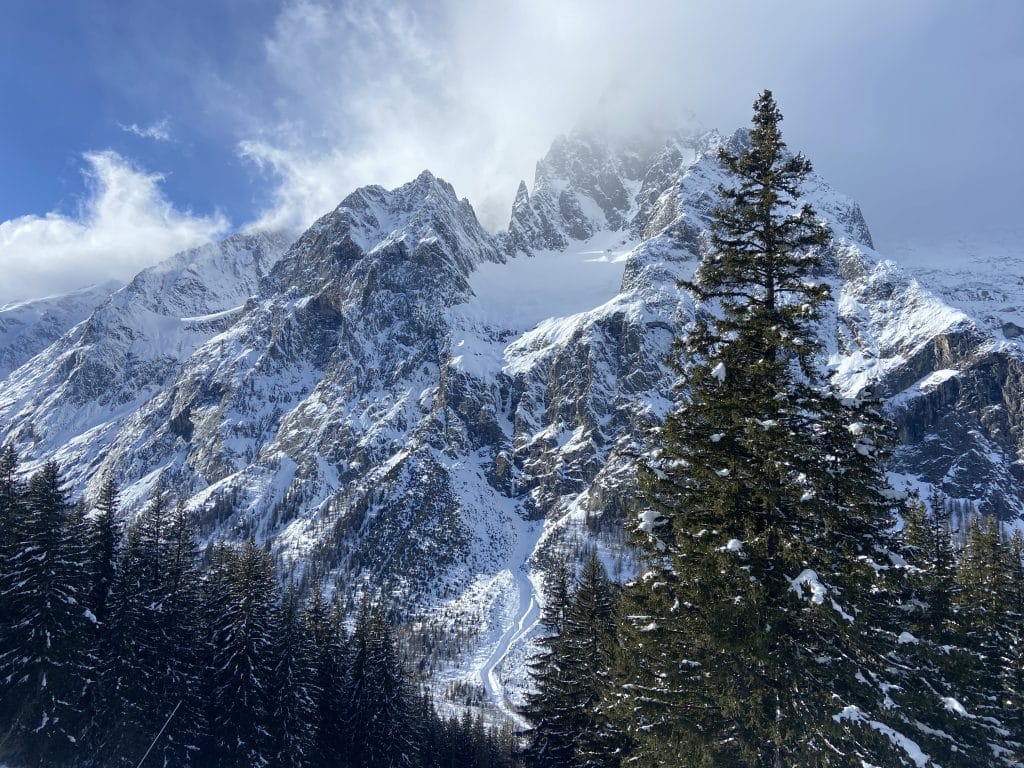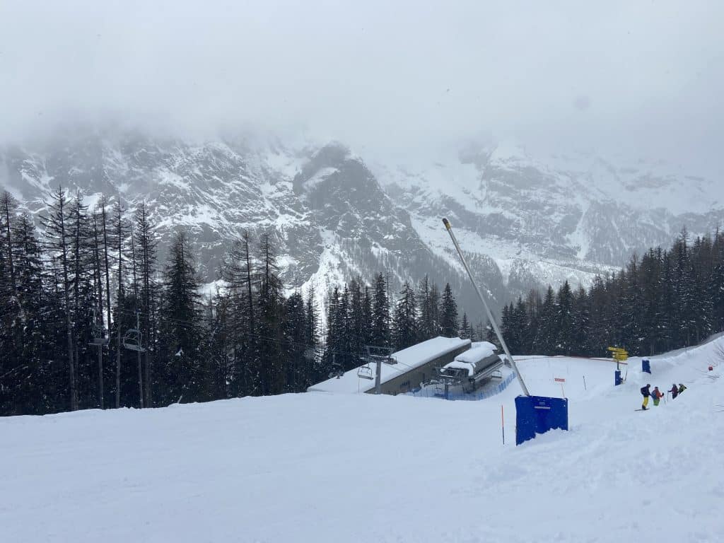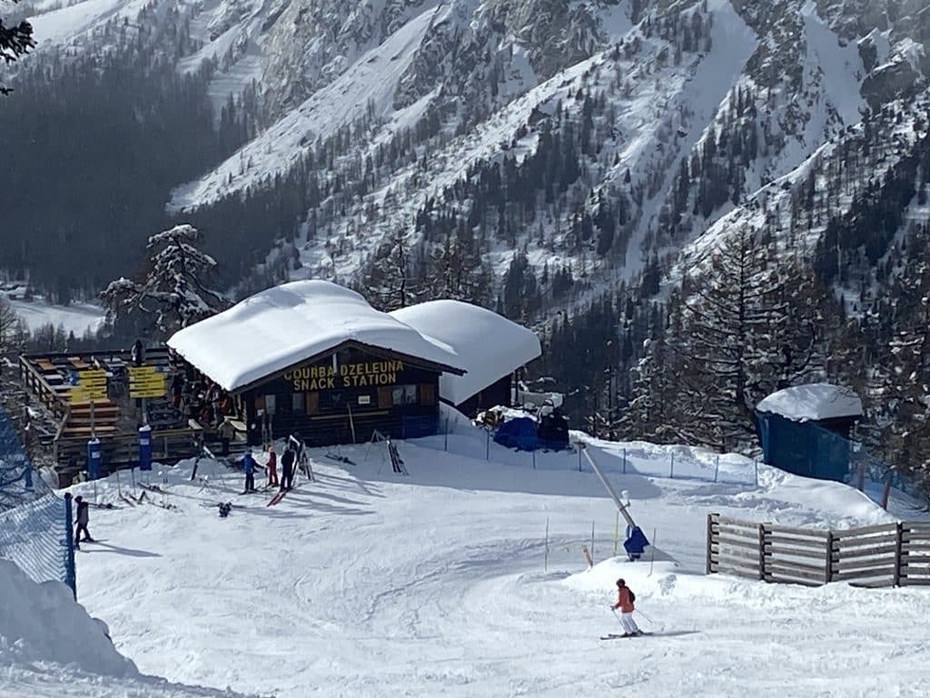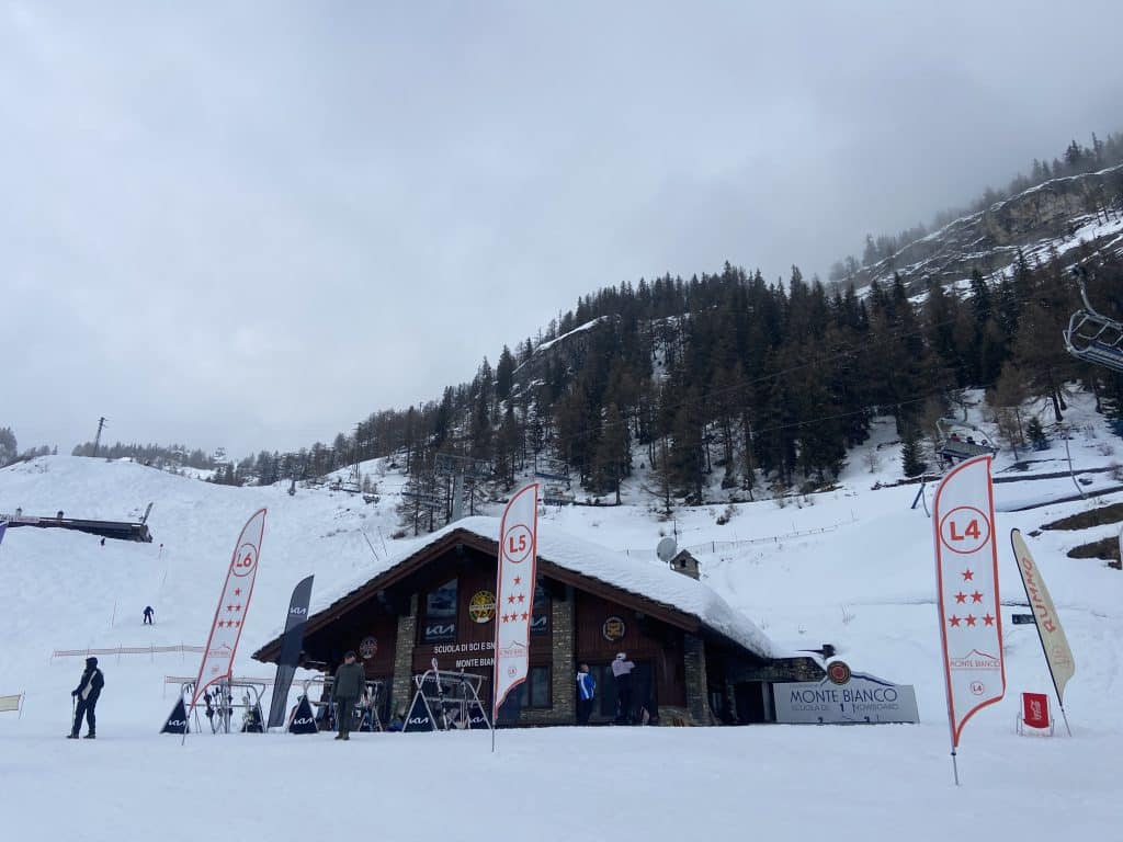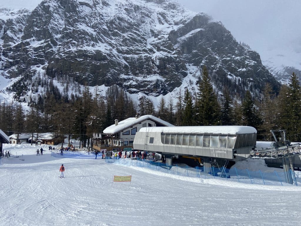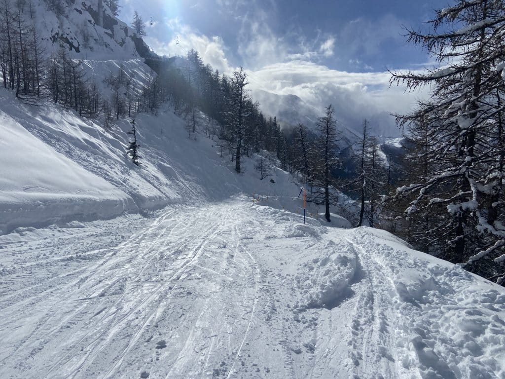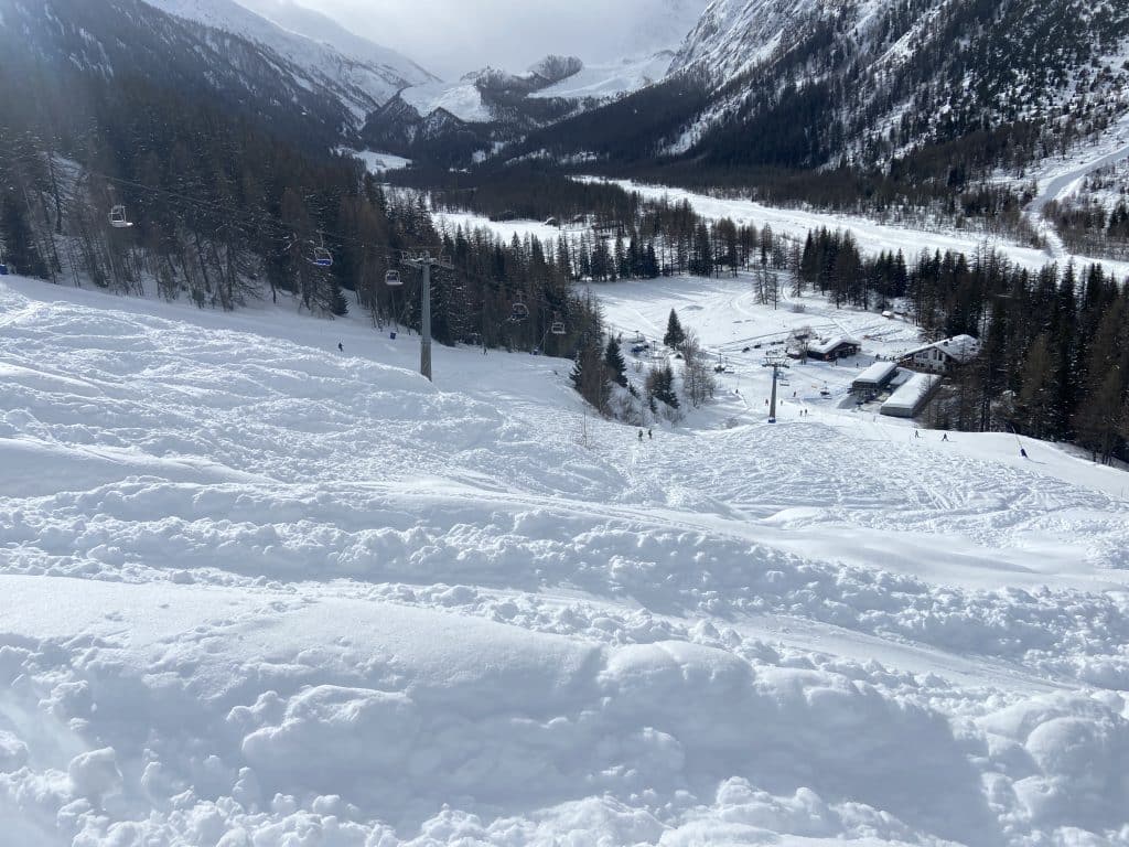 Le versant Val Veny de son côté offre une tout autre expérience, beaucoup plus près des Alpes comme les 3 Vallées ou d’autres grandes stations. Il y a de grandes pistes larges certes, pentues et bien aménagées, mais elles sont toutes reliées par une foule de petits sentiers boisés qui serpentent la montagne dans tous les sens. Nous avons vu beaucoup de sentiers similaires à Zermatt la semaine dernière. Pour nous canadiens, c’est très dépaysant et ça contribue à l’expérience de voyage.