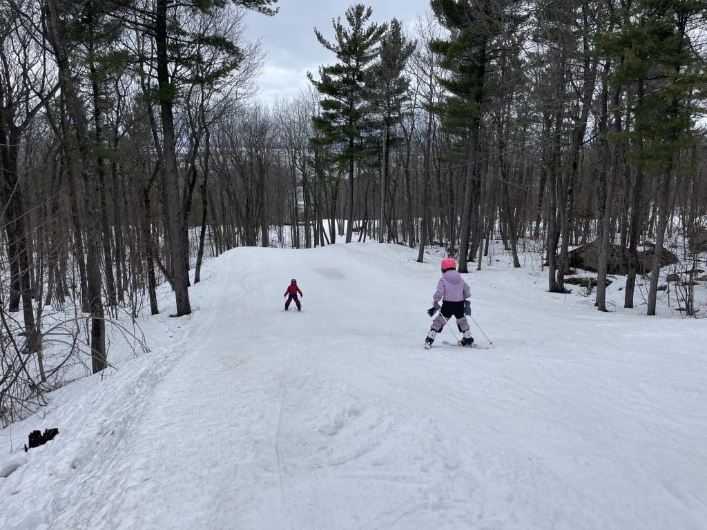 Nous avons ensuite fait à plusieurs reprises la piste 2 (Qui-sait-tout). Cette piste est particulièrement amusante puisqu’elle est plus étroite et bordée d’arbres. On a le sentiment d’être presque dans un sous-bois. De plus, c’est super de se laisser surprendre par les multiples valons pendant la descente!