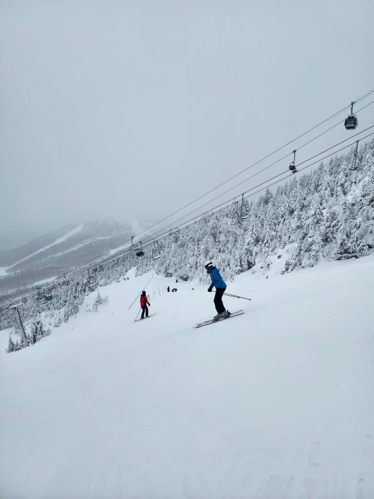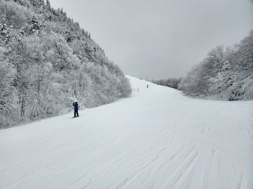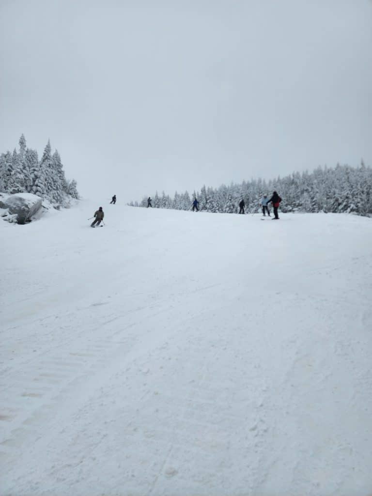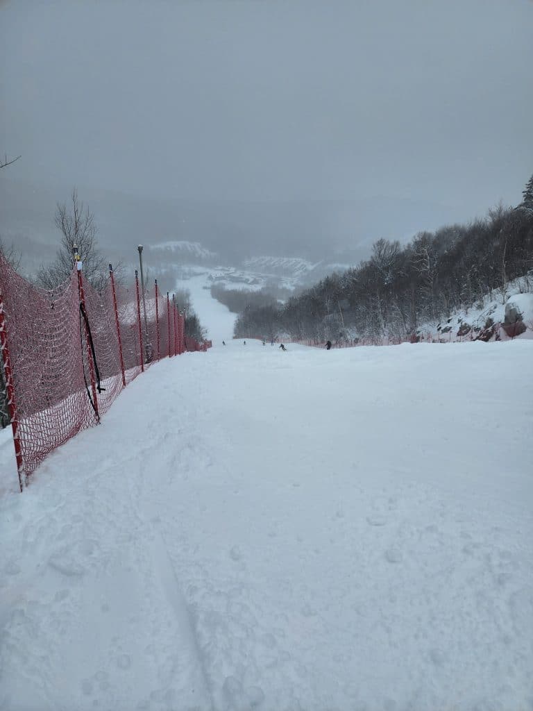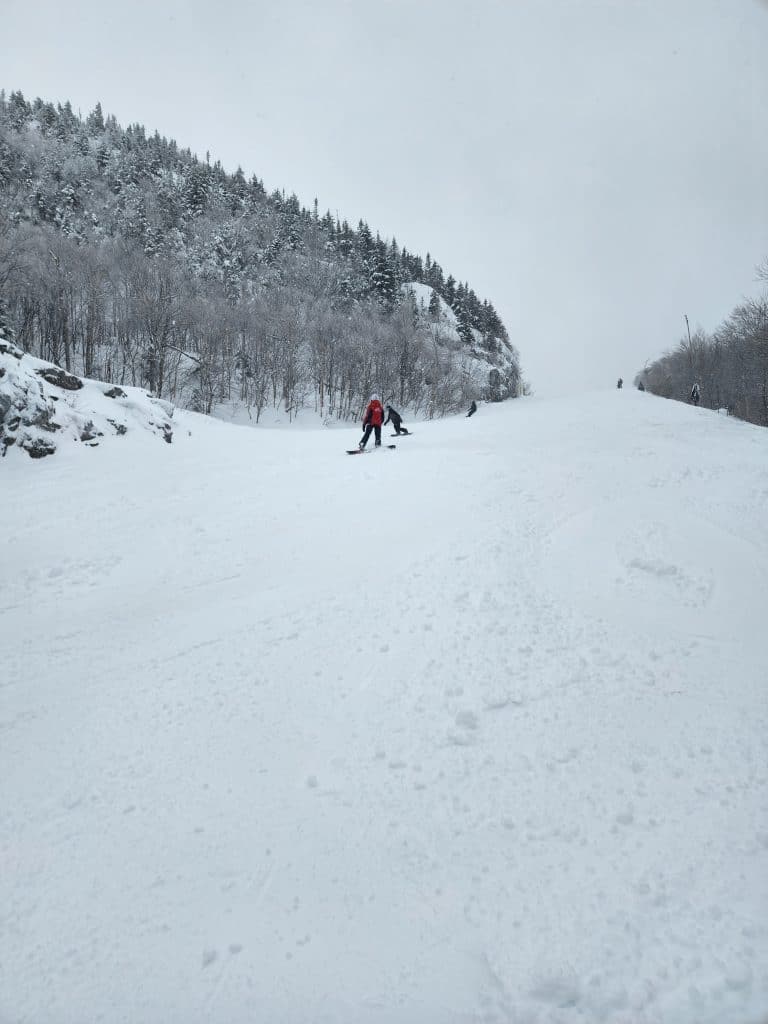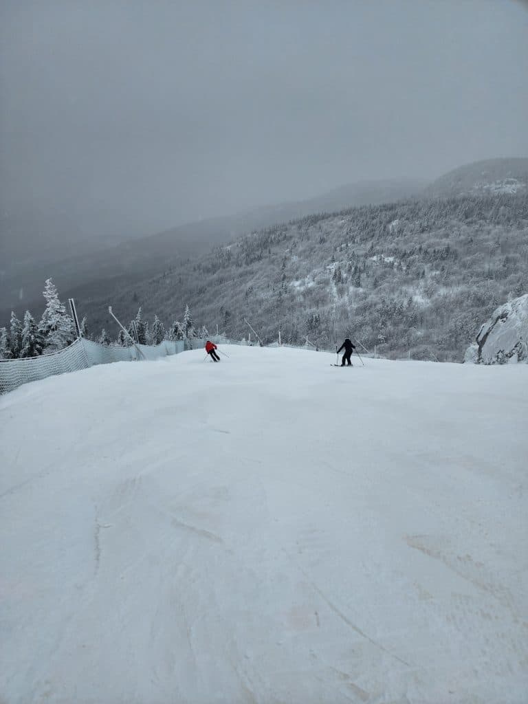 La station nous annonce que 85 % du domaine skiable est ouvert. On remarque rapidement que la grande proportion des pistes fermées sont situées sur le Mont Giroux Est, puisque le remonte-pente est fermé. Dans la piste Sherbrooke, il y a eu fabrication de neige artificielle et le nivellement avec les dameuses sera nécessaire avant l’ouverture de ces pistes.