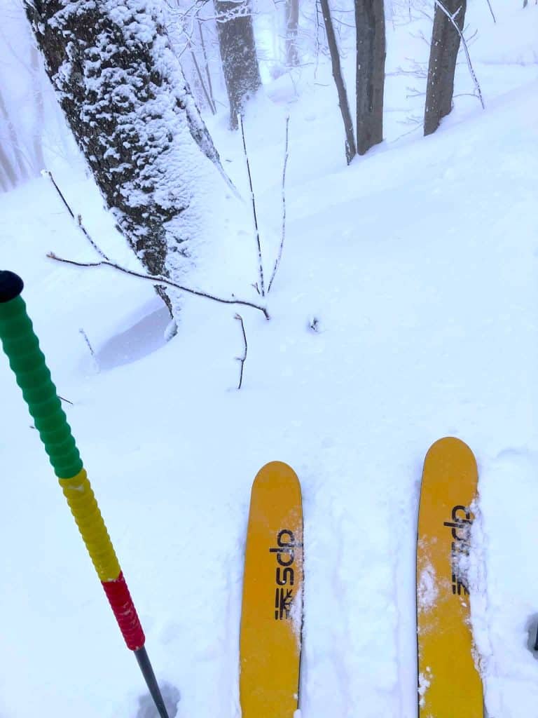 Toute la journée, j’ai eu droit à ce genre de ligne qui m’a donné une belle adrénaline digne de Sutton! Ce qui fait la renommée de ce terrain de jeu, ce sont ses sous-bois sublimes. Ils offrent une glisse fluide, instinctive et profondément connectée à la montagne. Les arbres créent un terrain de jeu unique où chaque descente devient différente. Sutton a su préserver la richesse sauvage en protégeant ses sous-bois, devenus un modèle en Amérique du Nord.