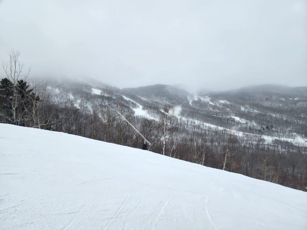 Avant de me rendre à la gondole, je vois un avertissement qui mentionne qu’il n’y a aucune piste facile accessible au sommet du mont Orford. Je me suis bien amusé dans la piste Maxi et dans la piste Trois-ruisseaux. Le nuage au sommet est probablement créé par la fabrication de neige artificielle.