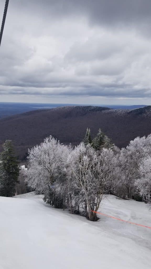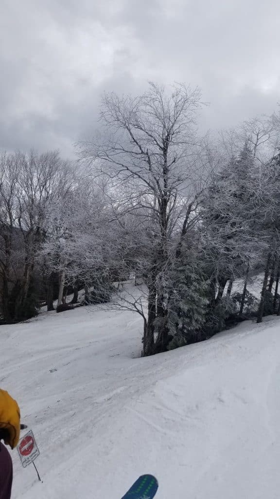 Dès nos premiers virages, on remarque les nuages dans le haut de la montagne et ils nous ont laissé un givre dans les branches au sommet de la montagne.