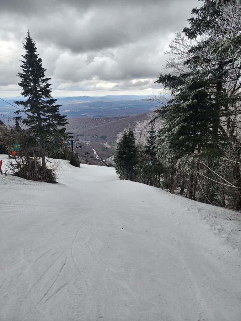 Dès nos premiers virages, on remarque les nuages dans le haut de la montagne et ils nous ont laissé un givre dans les branches au sommet de la montagne.