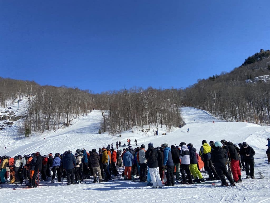 Il faut le dire, la station était passablement populaire ce matin. Il fait beau, la neige est bonne et plusieurs sont en vacances en ce samedi du President’s Day. En clair, il y a du monde, mais heureusement nous allons y retrouver beaucoup d’amis avec des sourires indescriptibles.