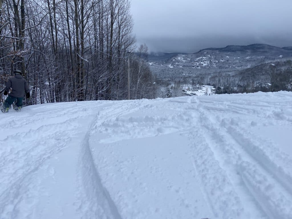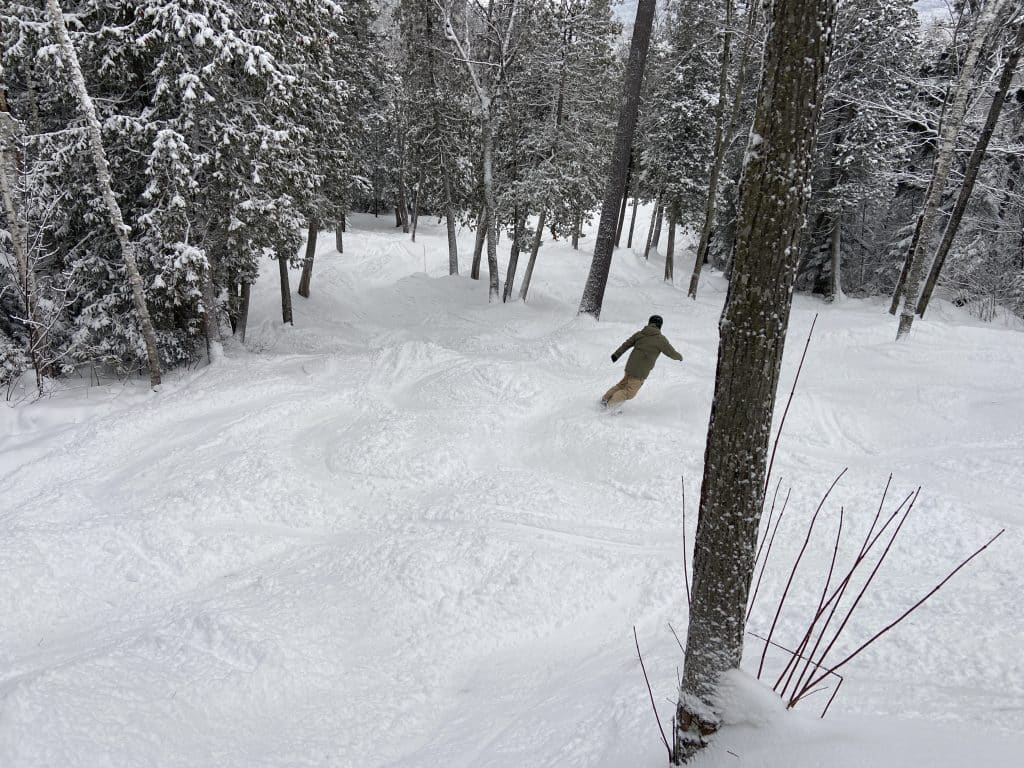 Les conditions étaient donc neige profonde, un peu dense, sur fond ferme et bien travaillé. Dans les sous-bois le fond était un peu plus croustillant à la suite des précipitations de vendredi, mais la grosse neige tapissait très bien le tout et se mélangera rapidement à la surface pour nous donner une bonne épaisseur de plus. C’était majestueux.
