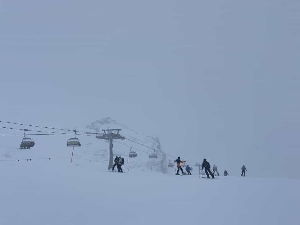 Comme nous ne pouvions assouvir notre premier désir, nous sommes tout de même montés jusqu’à Furggsattel pour refaire les pistes 72, 71 et 70 que nous avions tant appréciées la veille. Cette fois-ci on n’y voit pas vraiment plus clair, mais la nouvelle neige, un bon 7-8 centimètres, est abondante et offre une belle glisse.