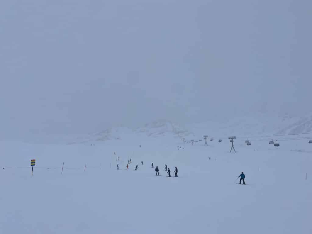 Le temps était plutôt clair à la base de la montagne mais ici, c’est la brume et le blizzard. De la belle neige fraîche cependant, mais pas de possibilité de skier ce secteur ce matin. La remontée fonctionne mais nous pourrions seulement y accéder en mode piéton pour aller visiter le musée de Glace au sommet. La vue, ce sera pour une autre occasion.