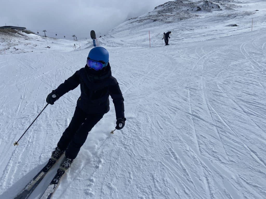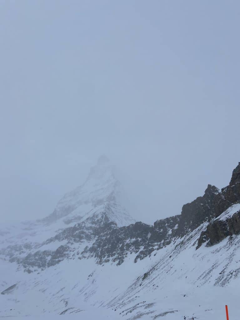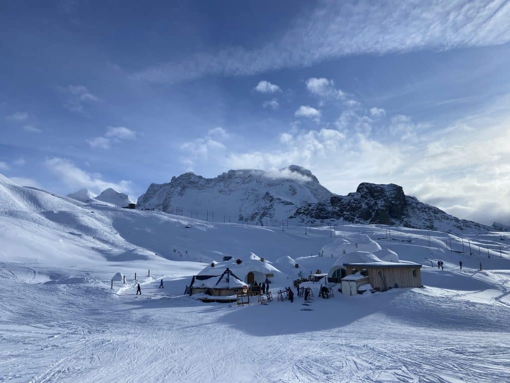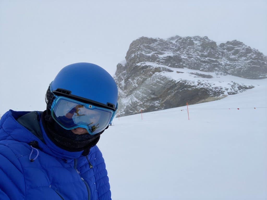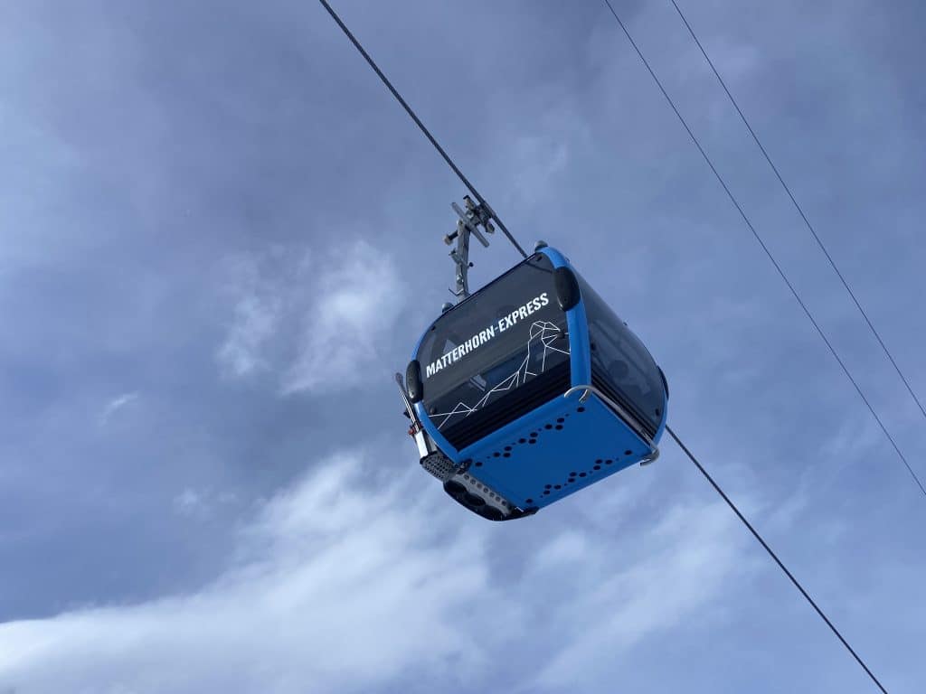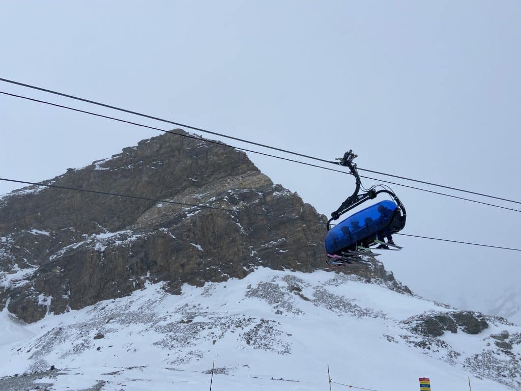 Notre objectif ultime pour aujourd’hui, le même depuis les trois derniers jours, est de monter tout en haut de Matterhorn Glacier Paradise (3 883 mètres) et d’aller skier les pistes des 80’s qui sont desservies par quatre arbalètes (t-bars) tout en haut du massif, juste dessous la télécabine 🚠 qui traverse en Italie 🇮🇹 au Plateau Rosa.