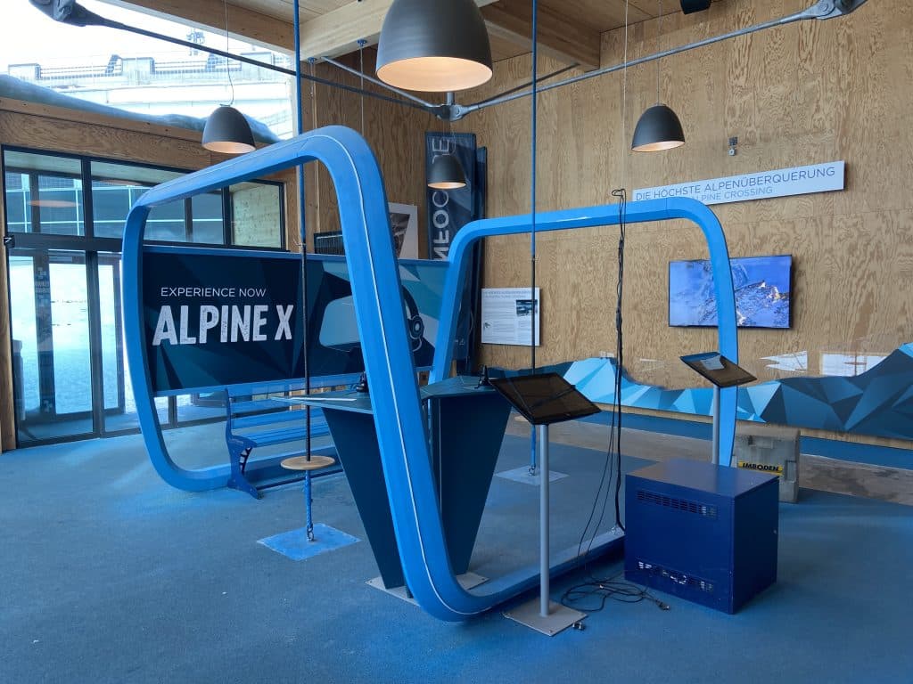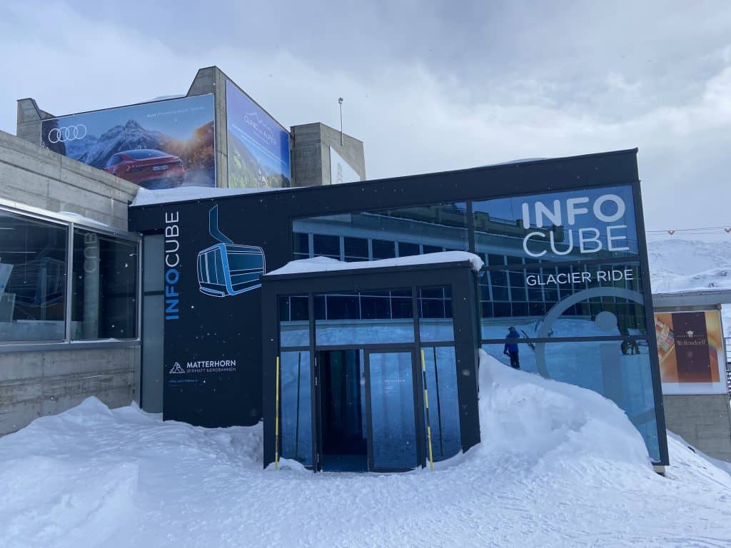 Plus tard dans la journée nous sommes revenus sur place et, faute de pouvoir monter skier même si la visibilité était alors excellente, nous avons pu visiter le Cube Info pour nous faire exposer les prouesses d’ingénierie de la construction de ce chef d’œuvre technique. Nous avons aussi visité l’intérieur du bâtiment d’arrivée de la remontée qui comprend un très beau restaurant, une boutique et une très belle terrasse. Un endroit à retenir lors de la planification du lunch.